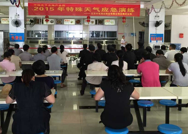 因北海天氣多變,特殊天氣隨時可能發(fā)生,為防止隨時可能出現(xiàn)的特殊天氣對園區(qū)安全帶來不利影響,確保園區(qū)設(shè)備財產(chǎn)的正常運轉(zhuǎn)、安全,確保園區(qū)安全生產(chǎn)零事故,同時為讓員工熟悉應(yīng)對特殊天氣的工作流程,做到工作有計劃性、準備工作及時到位、突發(fā)事件處理及時,園區(qū)物業(yè)公司(中電瑞達)于2015年6月9日下午,組織公司全體人員開展了一次特殊天氣應(yīng)急演練。整個演練分為:特殊天氣應(yīng)急預(yù)案培訓(xùn)、特殊天氣應(yīng)急演練兩大部分。為確保此次演練順利進行,物業(yè)公司積極準備,專門組織各部門負責人召開專題會議,完善方案、物資準備,部署每個演練環(huán)節(jié),明確人員分工、時間節(jié)點、演練流程。