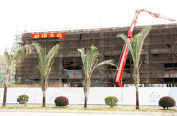 2010年11月29日上午十時(shí)三十八分,伴隨著震耳的爆竹聲,巨臂泵車將最后一車砼漿澆注在2#標(biāo)準(zhǔn)廠房樓頂,標(biāo)志著2#、3# 4.7萬平米標(biāo)準(zhǔn)廠房全面如期封頂,為重大項(xiàng)目入駐奠定了基礎(chǔ)。