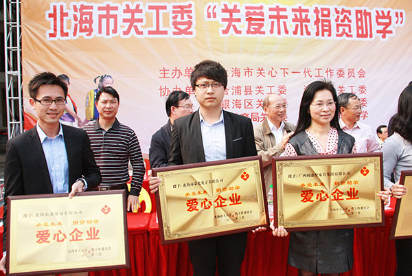 園區(qū)企業(yè)北海景光電子有限公司榮獲了“愛心企業(yè)”榮譽(yù)稱號(hào),這是繼去年景光電子捐贈(zèng)“女警護(hù)學(xué)崗”的又一獻(xiàn)愛心活動(dòng),同時(shí)是園區(qū)鼓勵(lì)企業(yè)積極響應(yīng)對(duì)“關(guān)愛未來捐資助學(xué)”的具體舉措。
