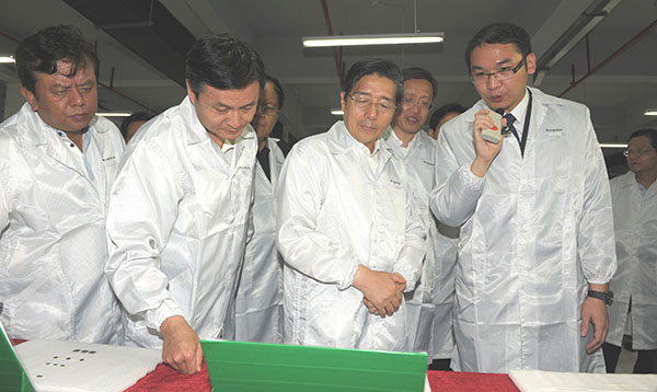 2011年6月21日,廣西壯族自治區(qū)黨委書記郭聲琨到北海調(diào)研千億元產(chǎn)業(yè)建設(shè)期間,在自治區(qū)黨委常委、政府副主席陳武,自治區(qū)黨委常委、統(tǒng)戰(zhàn)部部長黃道偉,自治區(qū)政府副主席林念修,北海市長連友農(nóng)等陪同下,赴中國電子北海產(chǎn)業(yè)園考察調(diào)研,并視察了國鈺電子、惠盛電子兩家入園企業(yè)。北海市委常委、常務(wù)副市長孫大光介紹了北海電子信息產(chǎn)業(yè)發(fā)展情況。郭聲琨書記詳細詢問了企業(yè)建設(shè)和發(fā)展情況,并親切看望和慰問了園區(qū)一線的建設(shè)者,并對他們?yōu)楸焙?、為廣西的經(jīng)濟建設(shè)付出的努力表示感謝。
