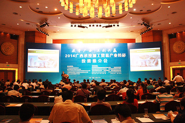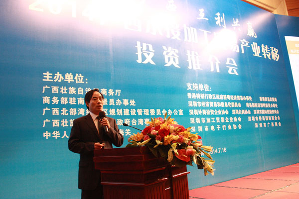 2014年7月16日,由自治區(qū)商務廳主辦的2014廣西承接加工貿(mào)易產(chǎn)業(yè)轉(zhuǎn)移投資推介會在深圳舉行。自治區(qū)政府副秘書長魏然,深圳市經(jīng)濟貿(mào)易和信息化委員會副主任高林等領(lǐng)導和嘉賓為會議致辭。自治區(qū)商務廳、北部灣辦分別從不同角度對廣西承接加工貿(mào)易產(chǎn)業(yè)轉(zhuǎn)移投資環(huán)境進行了推介。北海、欽州、梧州、南寧四個國家級加工貿(mào)易梯度轉(zhuǎn)移重點承接地,欽州保稅港區(qū)、憑祥綜合保稅區(qū)、北海出口加工區(qū)、中馬欽州產(chǎn)業(yè)園、東興國家重點開發(fā)開放試驗區(qū)、南寧高新技術(shù)產(chǎn)業(yè)開發(fā)區(qū)、中國電子北海產(chǎn)業(yè)園、梧州市粵桂合作特別實驗區(qū)八個重點園區(qū),分別就各自的產(chǎn)業(yè)布局、投資環(huán)境、政策優(yōu)勢進行了推介。香港特區(qū)政府駐粵辦、香港貿(mào)易發(fā)展局、深圳外商投資企業(yè)協(xié)會、深圳臺商協(xié)會、深圳市加工貿(mào)易企業(yè)協(xié)會、深圳市企業(yè)聯(lián)合會、深圳市電子行業(yè)協(xié)會及廣東各類加工貿(mào)易企業(yè)約400人出席了推介會。