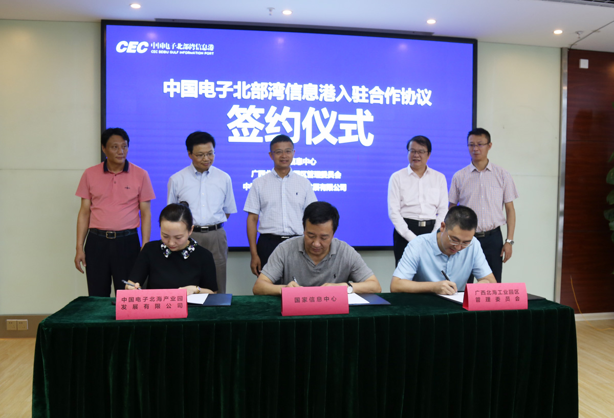 國(guó)家信息中心、北海工業(yè)園區(qū)管委會(huì)、中國(guó)電子北海產(chǎn)業(yè)園公司簽訂戰(zhàn)略合作協(xié)議(馬忠玉、郭彥江、白冰簽約;北海市委常委、副市長(zhǎng)陳新,中國(guó)科學(xué)院院士、北京大數(shù)據(jù)研究院院長(zhǎng)鄂維南,中國(guó)信息協(xié)會(huì)副會(huì)長(zhǎng)朱玉,北京正宏置業(yè)集團(tuán)有限公司董事長(zhǎng)徐俊男,國(guó)家信息中心信息與網(wǎng)絡(luò)安全部副主任祿凱共同見(jiàn)證簽約儀式)