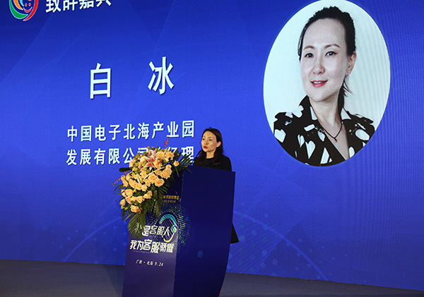 中國電子北海產(chǎn)業(yè)園公司總經(jīng)理白冰在頒獎(jiǎng)晚會(huì)上致辭